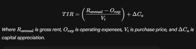 Where R_{annual} is gross rent, O_{exp} is operating expenses, V_i is purchase price, and Delta C_a is capital appreciation.
